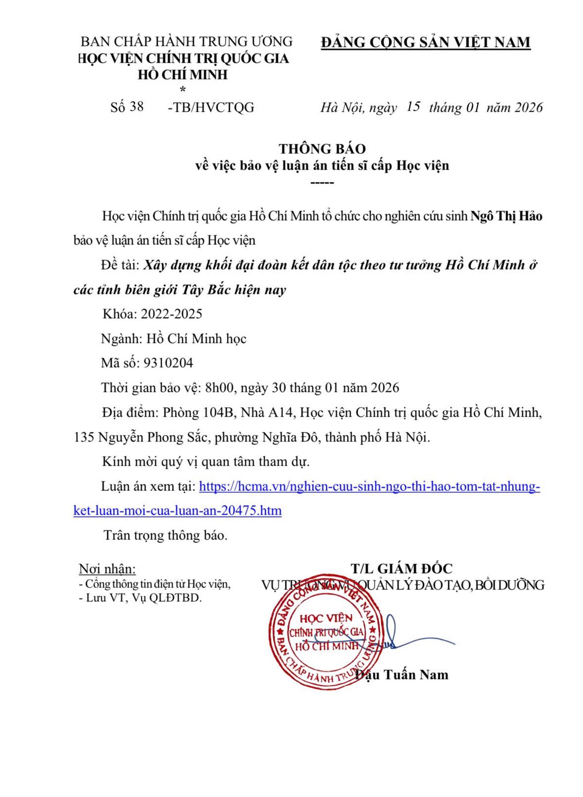 Thông báo bảo vệ luận án tiến sĩ cho Nghiên cứu sinh Ngô Thị Hảo