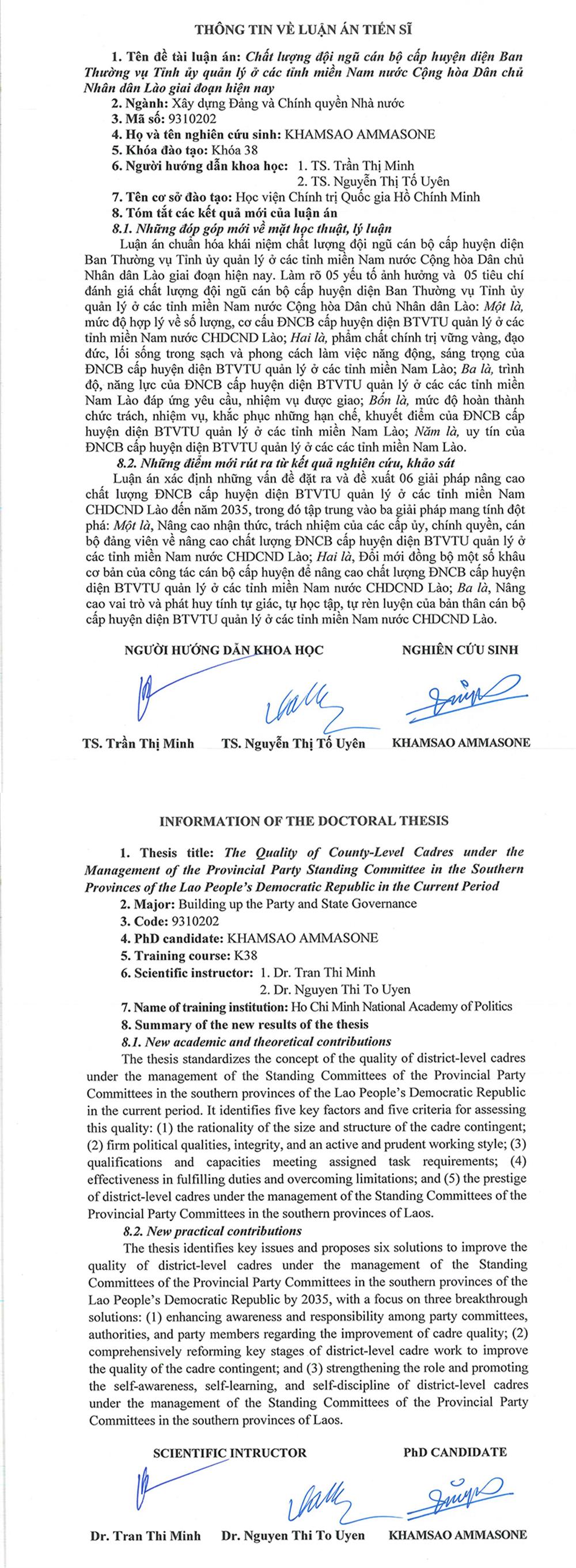 Nghiên cứu sinh KHAMSAO AMMASONE tóm tắt những kết luận mới của luận án