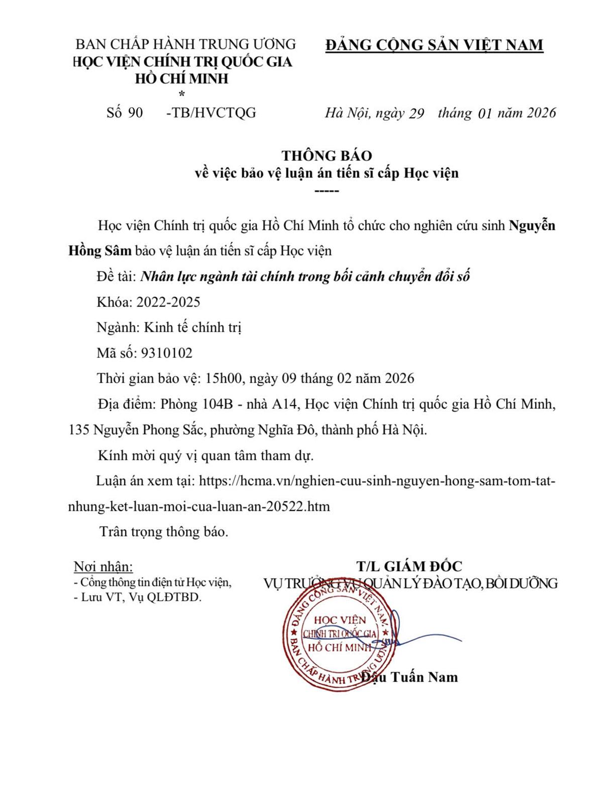 Thông báo bảo vệ luận án tiến sĩ cho Nghiên cứu sinh Nguyễn Hồng Sâm