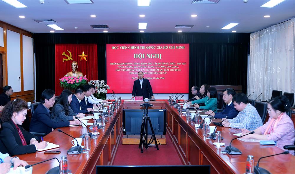 Chiều ngày 29/01/2026, Học viện Chính trị quốc gia Hồ Chí Minh tổ chức Hội nghị triển khai chương trình khoa học cấp bộ trọng điểm 2026-2027 “Tăng cường bảo vệ nền tảng tư tưởng của Đảng, đấu tranh phản bác các quan điểm sai trái, thù địch trong bối cảnh chuyển đổi số”. PGS,TS Lê Hải Bình, Ủy viên Trung ương Đảng, Phó Giám đốc Học viện dự và chủ trì hội nghị.