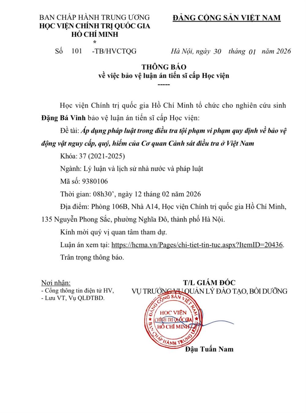 Thông báo bảo vệ luận án tiến sĩ cho Nghiên cứu sinh Đặng Bá Vinh