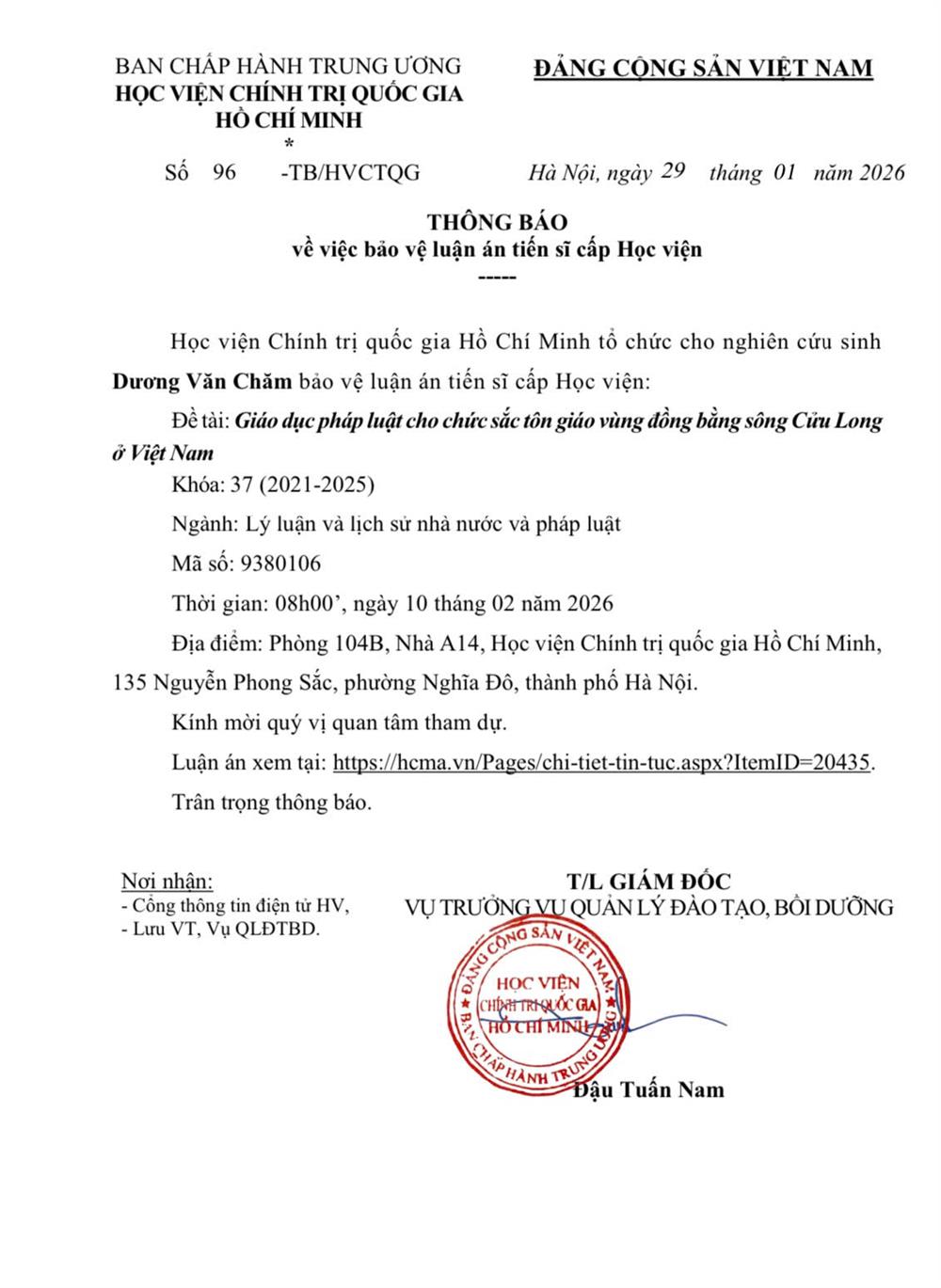 Thông báo bảo vệ luận án tiến sĩ cho Nghiên cứu sinh Dương Văn Chăm