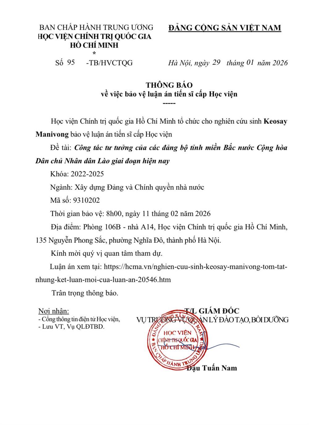 Thông báo bảo vệ luận án tiến sĩ cho Nghiên cứu sinh Keosay Manivong