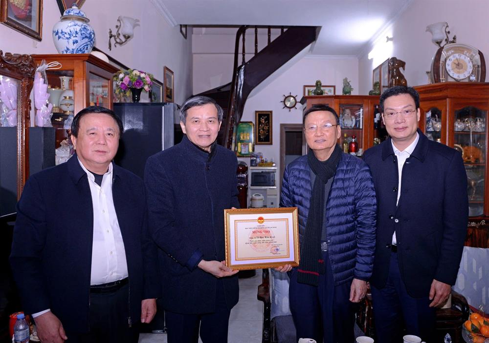 PGS,TS Đoàn Minh Huấn, Ủy viên Bộ Chính trị, Giám đốc Học viện và GS,TS Nguyễn Xuân Thắng, nguyên Ủy viên Bộ Chính trị, nguyên Giám đốc Học viện mừng thọ và chúc Tết đồng chí Tô Huy Rứa, nguyên Giám đốc Học viện