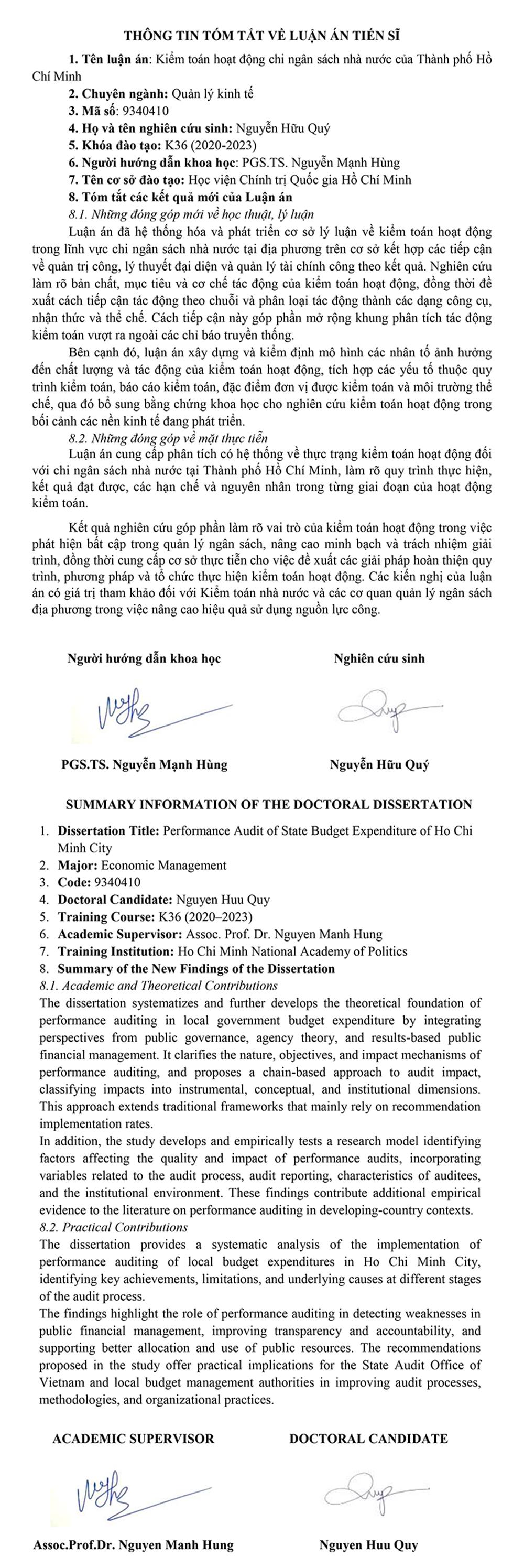 Luận án và tóm tắt luận án của Nghiên cứu sinh Đinh Vũ Minh sau bảo vệ cấp Học viện