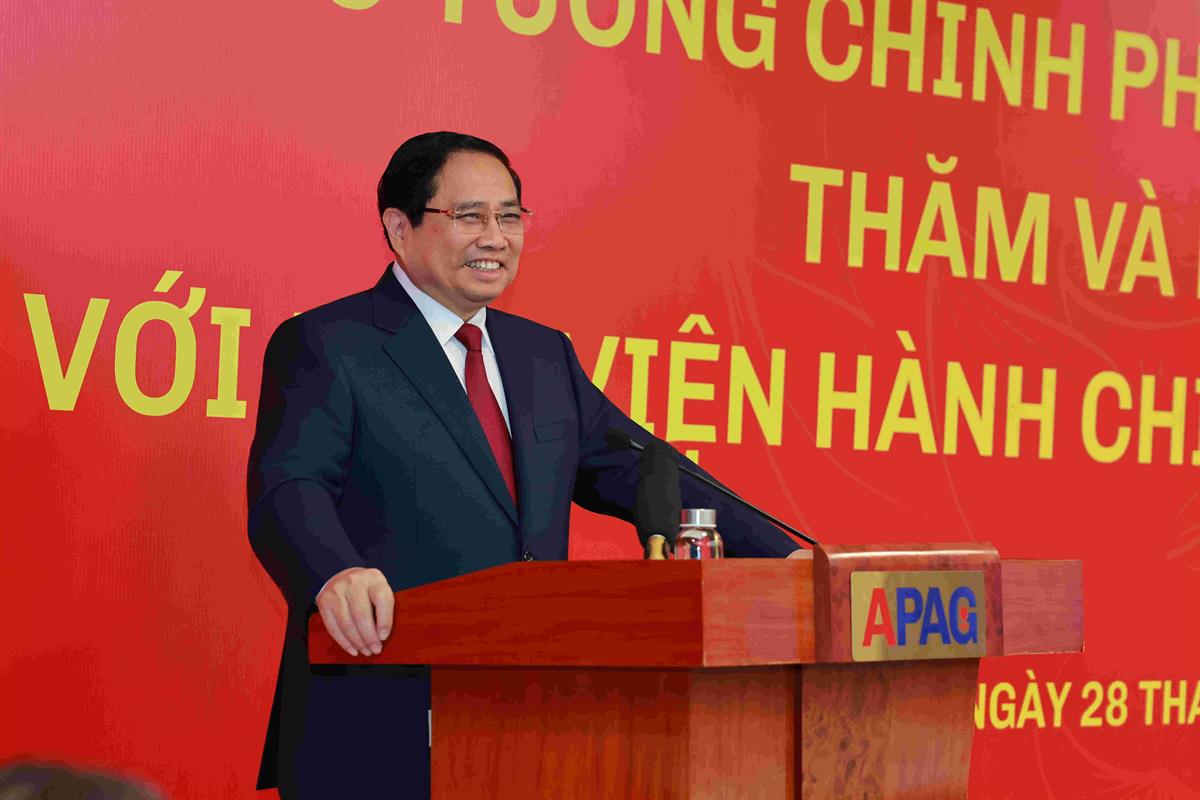 Phát biểu tại buổi làm việc, thay mặt lãnh đạo Đảng, Nhà nước, Thủ tướng Phạm Minh Chính gửi lời chúc mừng năm mới tốt đẹp nhất, đồng thời trân trọng cảm ơn, ghi nhận và đánh giá cao những nỗ lực, cống hiến của các thế hệ viên chức, người lao động Học viện Hành chính và Quản trị công trong gần 70 năm qua. Thủ tướng Chính phủ đánh giá cao những thành tựu của Học viện Hành chính và Quản trị công trong gần 7 thập kỷ qua, đặc biệt sau một năm vận hành theo mô hình tổ chức mới trong hệ thống Học viện Chính trị quốc gia Hồ Chí Minh.