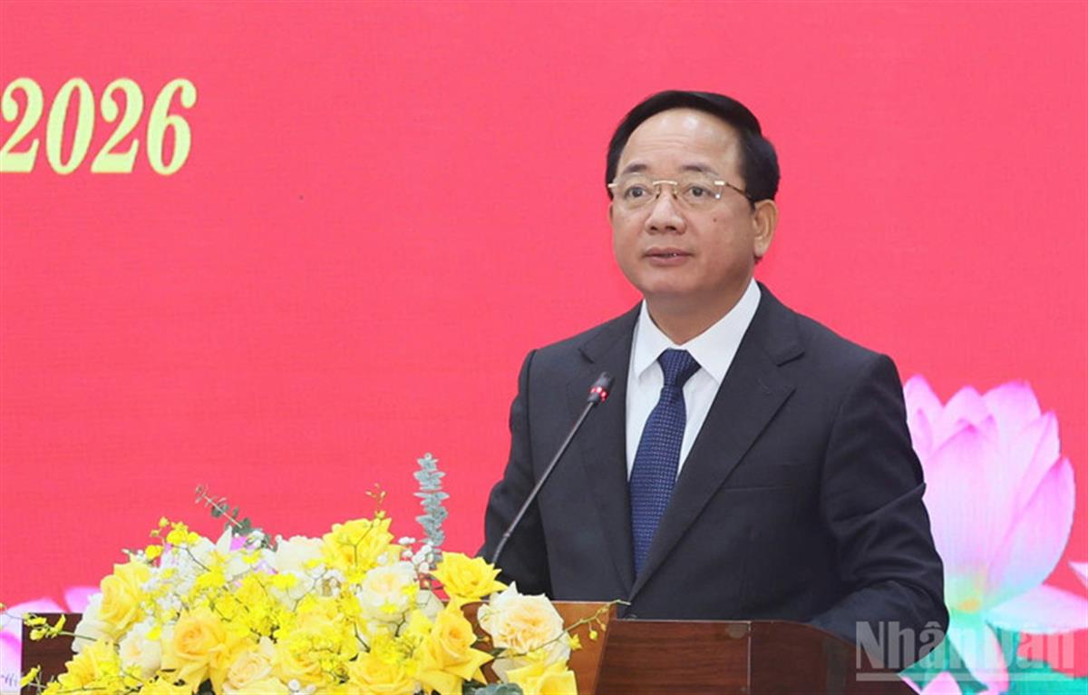 Ủy viên Bộ Chính trị, Giám đốc Học viện Chính trị quốc gia Hồ Chí Minh Đoàn Minh Huấn phát biểu _ ảnh: báo Nhân Dân