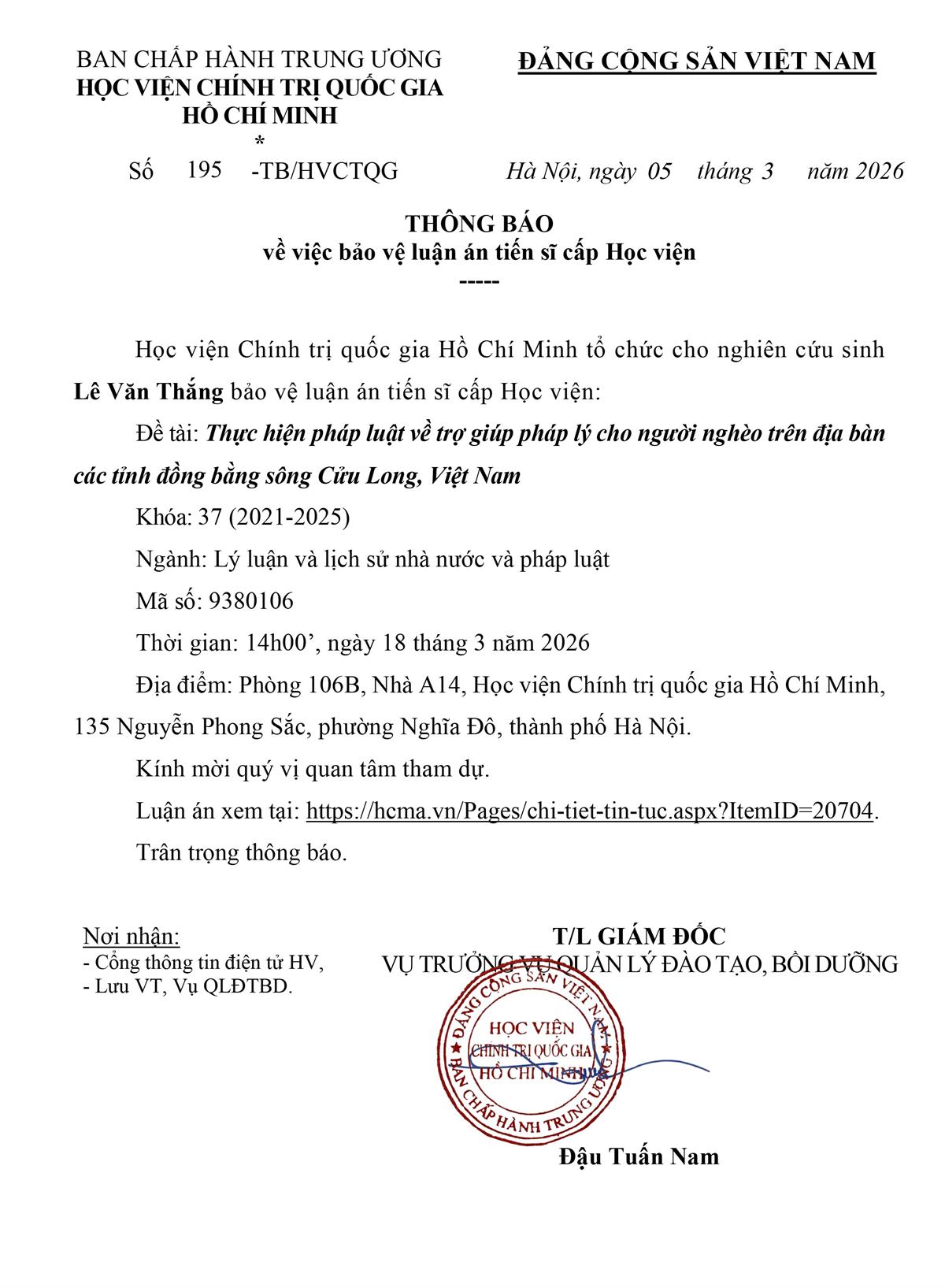 Thông báo tổ chức bảo vệ luận án tiến sĩ cho Nghiên cứu sinh Lê Văn Thắng