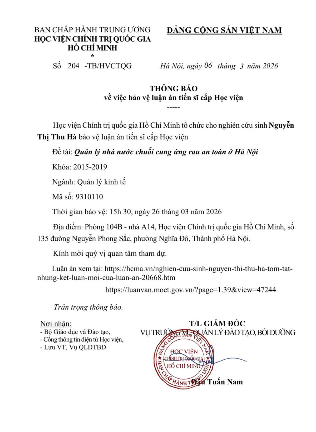 Thông báo tổ chức bảo vệ luận án tiến sĩ cho Nghiên cứu sinh Nguyễn Hoài Nam