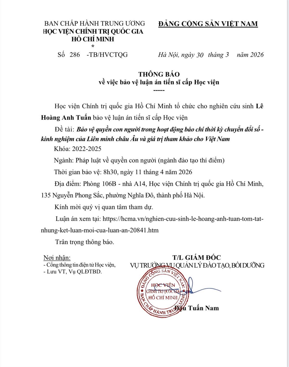 Thông báo tổ chức bảo vệ luận án tiến sĩ cho Nghiên cứu sinh Lê Hoàng Anh Tuấn