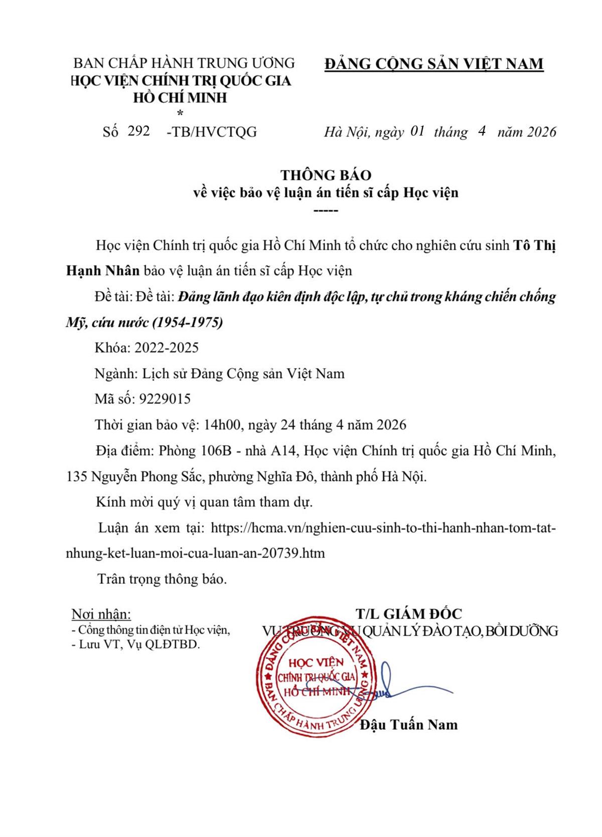 Thông báo tổ chức bảo vệ luận án tiến sĩ cho Nghiên cứu sinh Tô Thị Hạnh Nhân