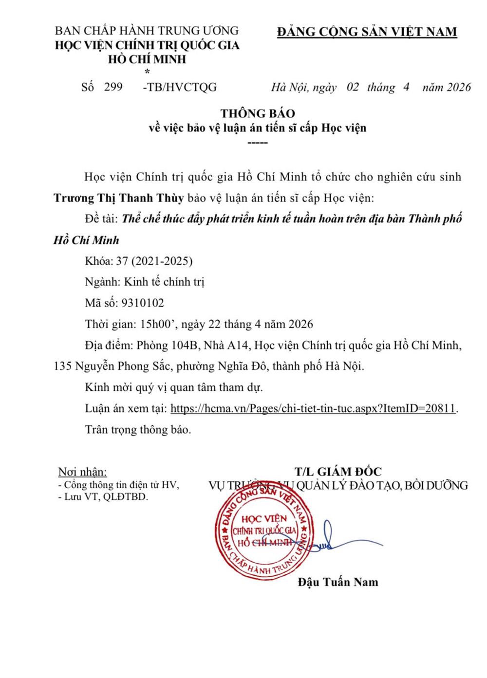 Thông báo tổ chức bảo vệ luận án tiến sĩ cho Nghiên cứu sinh Trương Thị Thanh Thùy
