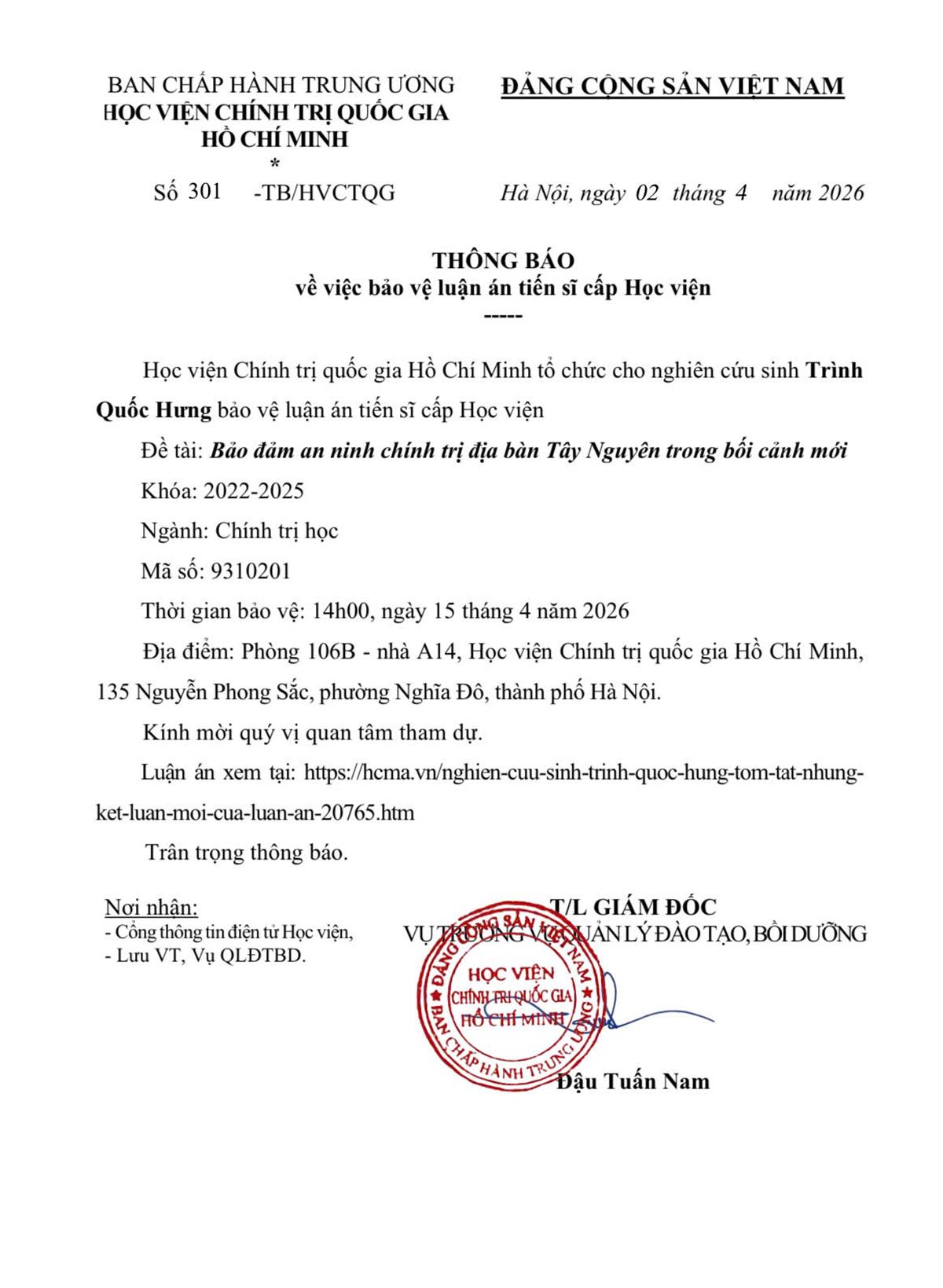 Thông báo tổ chức bảo vệ luận án tiến sĩ cho Nghiên cứu sinh Trình Quốc Hưng