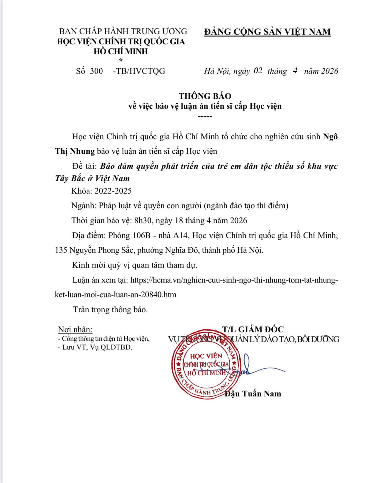 Thông báo tổ chức bảo vệ luận án tiến sĩ cho Nghiên cứu sinh Ngô Thị Nhung