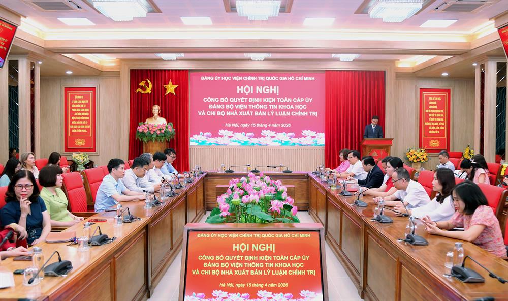 Sáng ngày 15/4/2026, Đảng ủy Học viện Chính trị quốc gia Hồ Chí Minh tổ chức Lễ công bố kiện toàn cấp ủy Đảng bộ Viện Thông tin khoa học và Chi bộ Nhà xuất bản Lý luận chính trị, nhiệm kỳ 2025-2030. TS Trương Công Đắc, Phó Bí thư Chuyên trách Đảng ủy Học viện dự và chủ trì hội nghị.