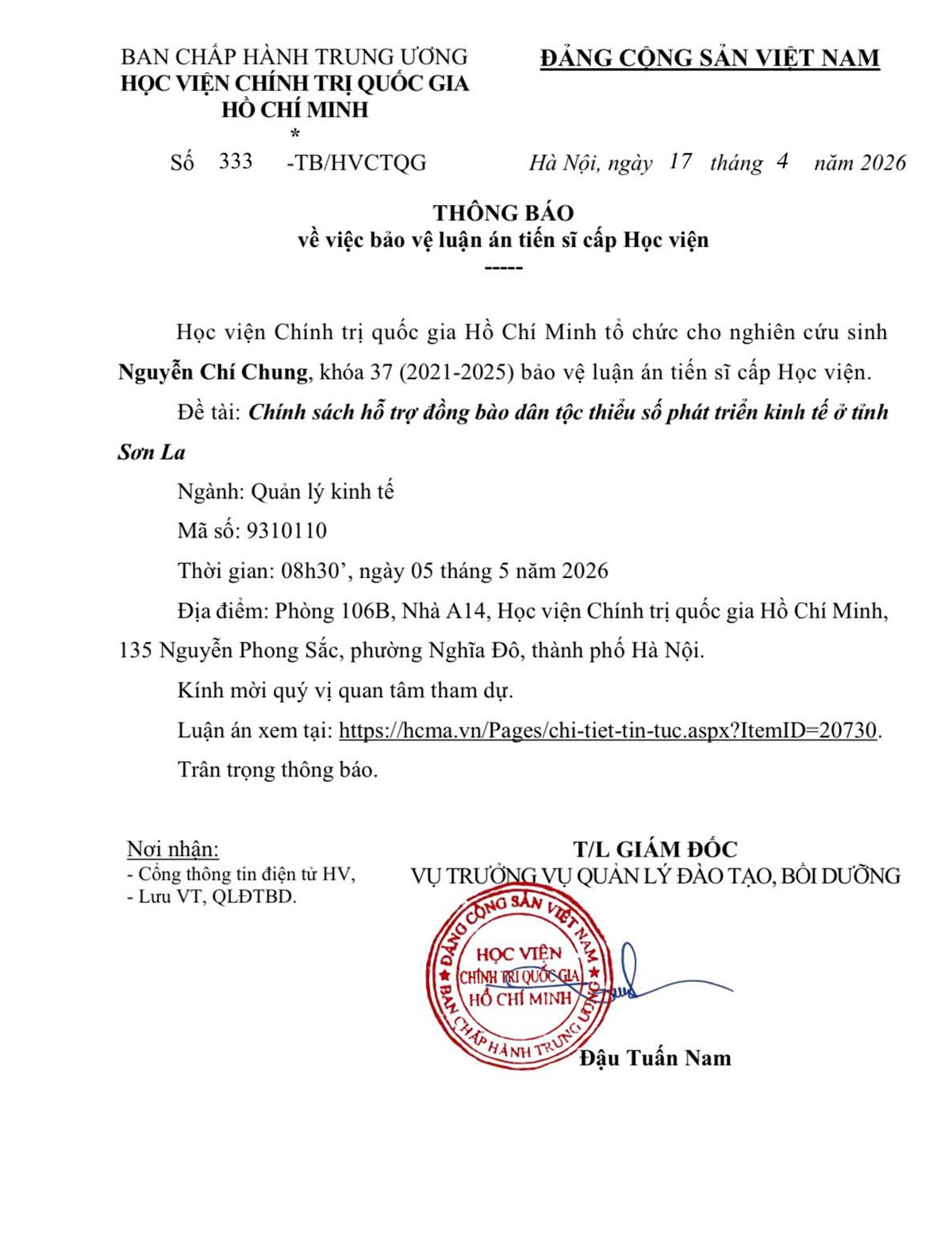 Thông báo tổ chức bảo vệ luận án tiến sĩ cho Nghiên cứu sinh Nguyễn Chí Chung