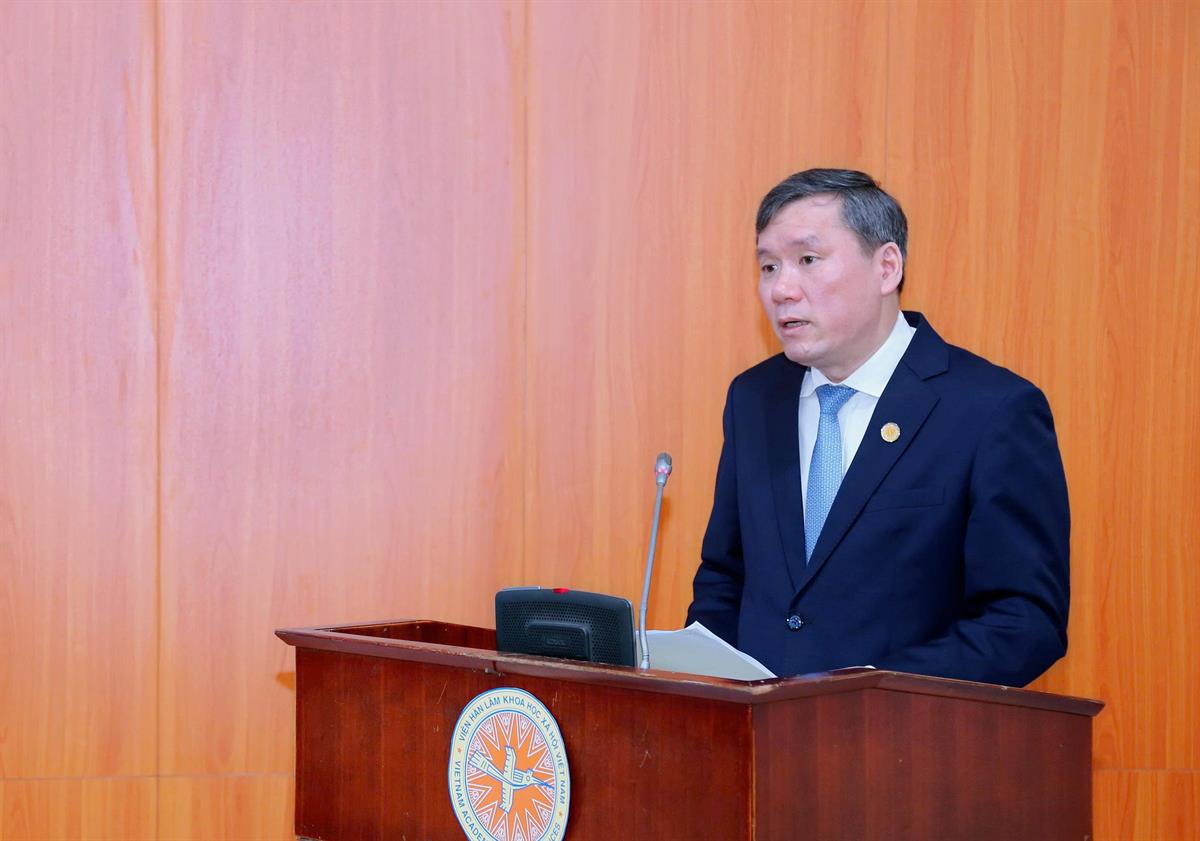 GS,TS Lê Văn Lợi, Ủy viên Trung ương Đảng, Chủ tịch Viện Hàn lâm Khoa học xã hội Việt Nam phát biểu chào mừng hội thảo