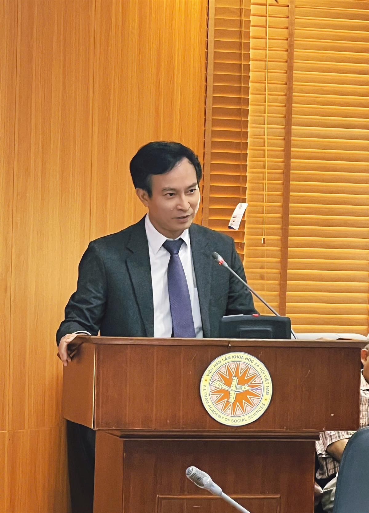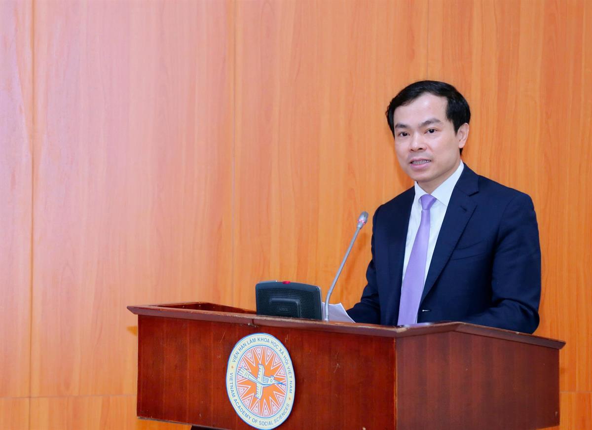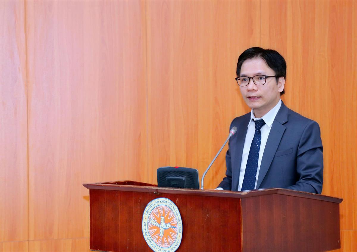 PGS,TS Nguyễn Xuân Trung, Viện trưởng Viện Nghiên cứu Nam Á, Tây Á và châu Phi thuộc Viện Hàn lâm Khoa học xã hội Việt Nam báo cáo tại hội thảo