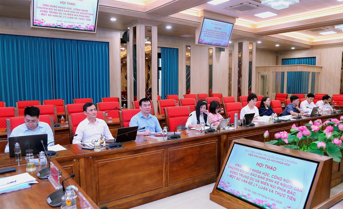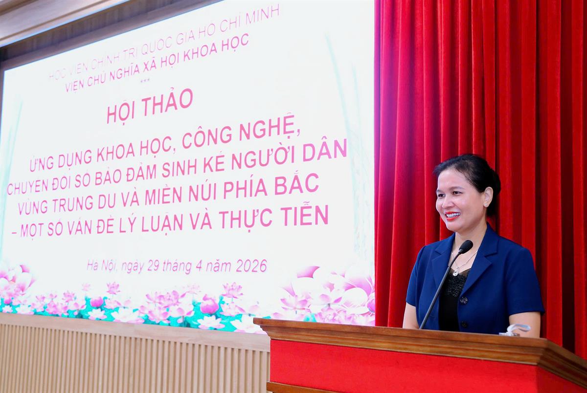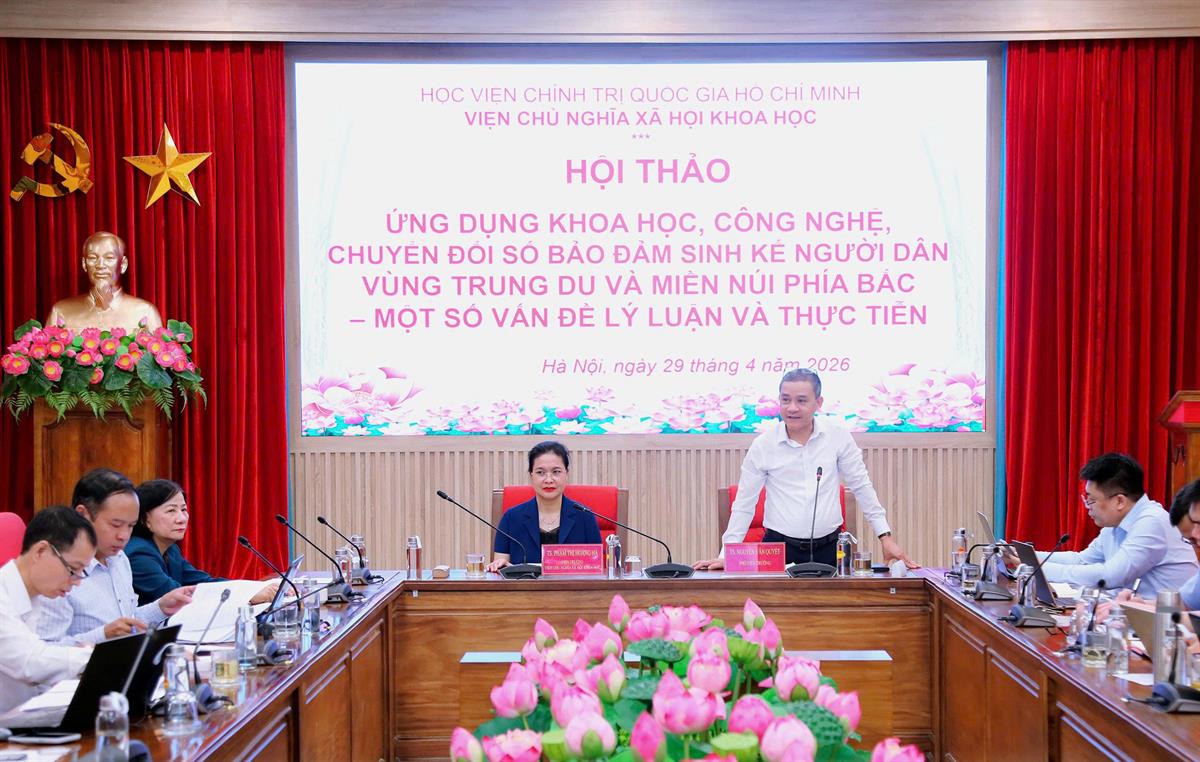Sáng ngày 29/4/2026, tại Hà Nội, Viện Chủ nghĩa xã hội khoa học, Học viện Chính trị quốc gia Hồ Chí Minh tổ chức Hội thảo khoa học với chủ đề “Ứng dụng khoa học, công nghệ, chuyển đổi số bảo đảm sinh kế người dân vùng Trung du và miền núi phía Bắc - Một số vấn đề lý luận và thực tiễn”. TS Phạm Thị Hoàng Hà, Viện trưởng và TS Nguyễn Văn Quyết, Phó Viện trưởng Viện Chủ nghĩa xã hội khoa học đồng chủ trì hội thảo.