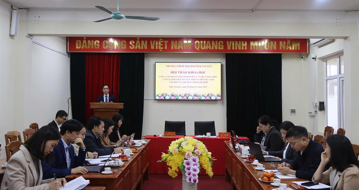 Chiều ngày 5/2/2026, Trường Chính trị tỉnh Thái Nguyên tổ chức Hội thảo khoa học với chủ đề “Nâng cao chất lượng đào tạo, bồi dưỡng công chức cấp xã tỉnh Thái Nguyên theo vị trí việc làm - Vai trò của Trường Chính trị tỉnh”. Hội thảo là hoạt động khoa học có ý nghĩa thiết thực, góp phần làm rõ cơ sở lý luận và thực tiễn nhằm đổi mới, nâng cao chất lượng công tác đào tạo, bồi dưỡng đội ngũ công chức cấp xã trong bối cảnh triển khai mô hình chính quyền địa phương hai cấp, đặt ra yêu cầu mới đối với năng lực, trách nhiệm và hiệu quả thực thi công vụ của đội ngũ công chức ở cơ sở.