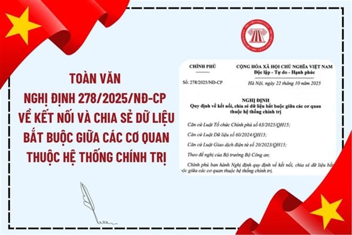 Ngày 22/10/2025, Chính phủ ban hành Nghị định 278/2025/NĐ-CP quy định về kết nối và chia sẻ dữ liệu bắt buộc giữa các cơ quan thuộc hệ thống chính trị.