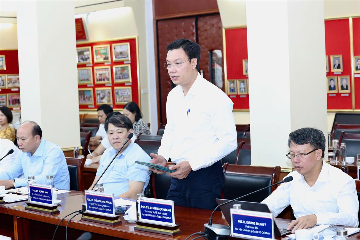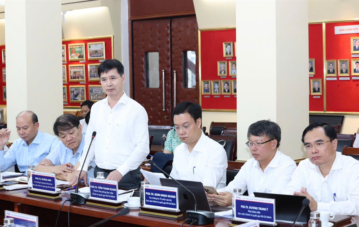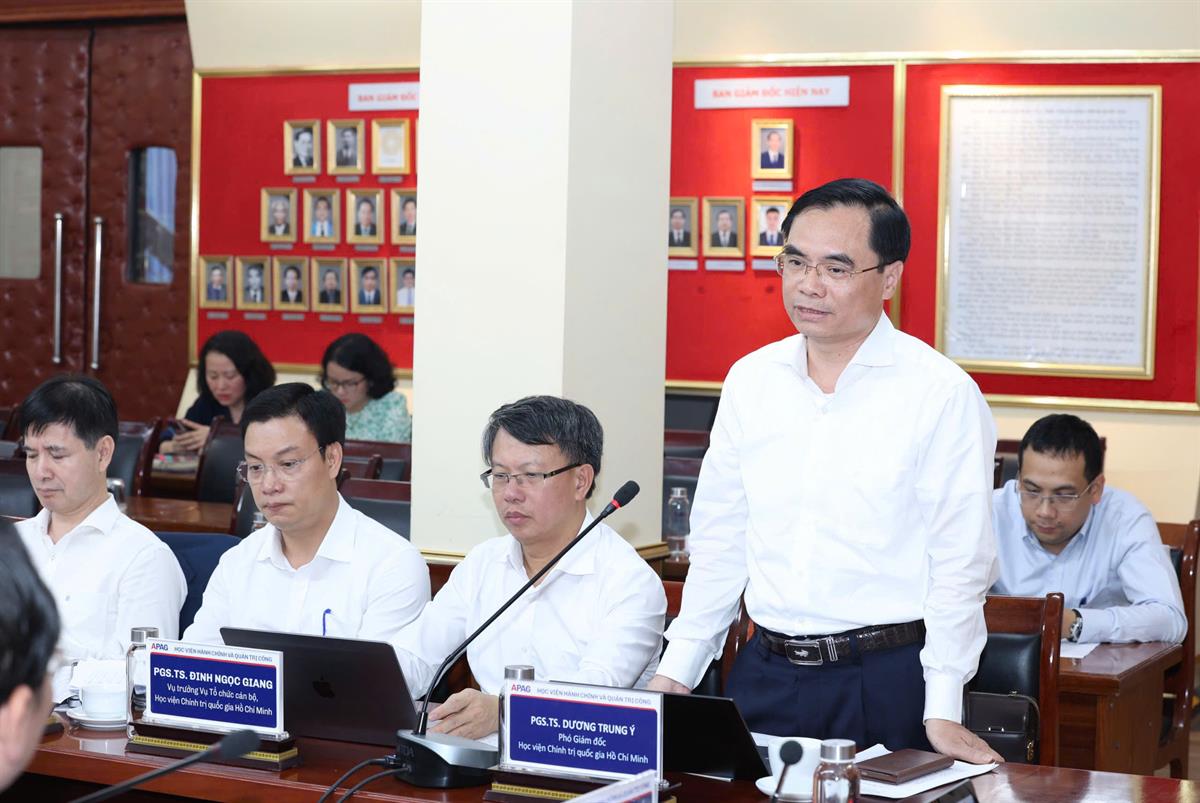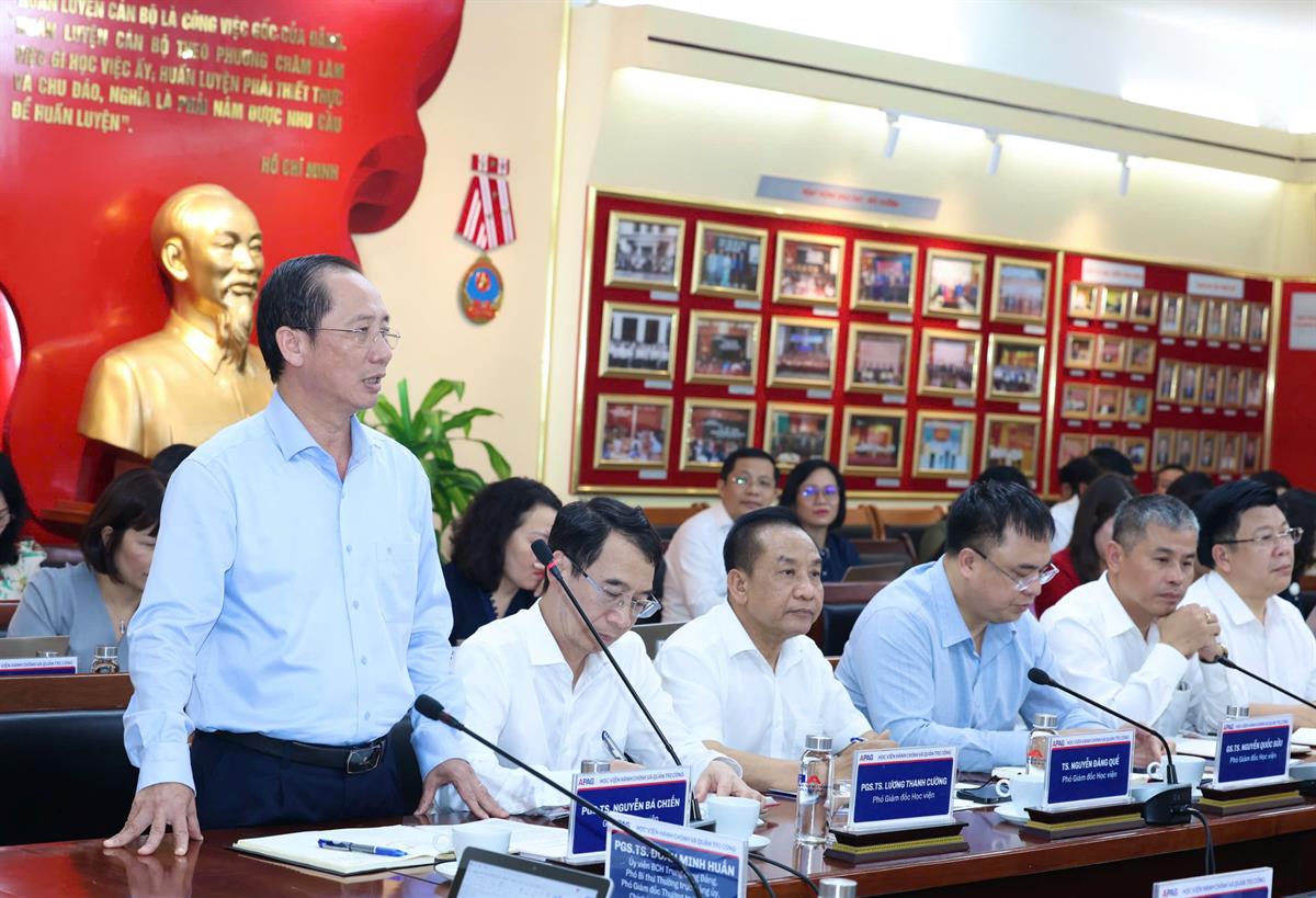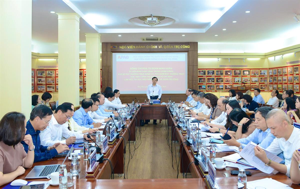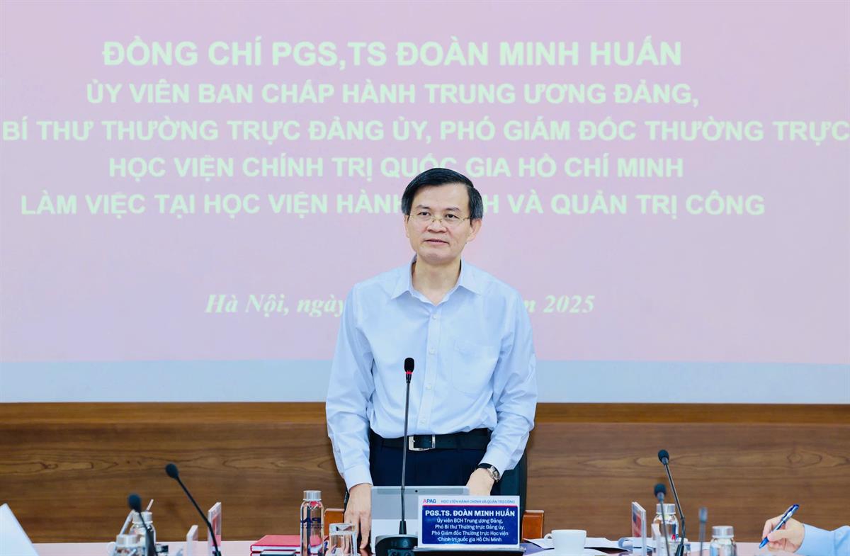 Phát biểu kết luận buổi làm việc, PGS,TS Đoàn Minh Huấn, Ủy viên Trung ương Đảng, Phó Giám đốc thường trực Học viện Chính trị quốc gia Hồ Chí Minh ghi nhận và đánh giá cao những kết quả quan trọng mà Học viện Hành chính và Quản trị công đã đạt được, đặc biệt là trong bối cảnh sát nhập, sắp xếp từ đầu năm 2025 đến nay.