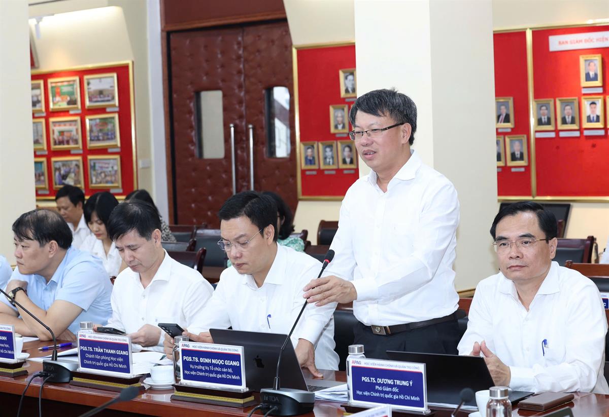 Nhấn mạnh Học viện Hành chính và Quản trị công phải là hình mẫu của một mô hình quản trị khoa học và hiện đại, PGS,TS Dương Trung Ý đề xuất Học viện Hành chính và Quản trị công cần tiếp tục giải quyết tốt mối quan hệ giữa thực hiện đầy đủ chức năng, nhiệm vụ của một Học viện chuyên ngành, một cơ sở đào tạo, bồi dưỡng trọng điểm quốc gia về hành chính, quản lý nhà nước và quản trị công, với chức năng là một cơ sở của Trường Đảng, thuộc Học viện Chính trị quốc gia Hồ Chí Minh; xác định rõ sứ mệnh, tầm nhìn, mục tiêu, phương châm, triết lý đào tạo, bồi dưỡng để truyền thông, lan tỏa và khẳng định vai trò, vị thế, uy tín của Học viện trong nước, quốc tế…; tiếp tục nghiên cứu hoàn thiện tổ chức bộ máy, xác định mô hình quản trị của Học viện theo hướng: khoa học, tiên tiến, hiện đại, tiên phong về mô hình quản trị thông minh phục vụ đắc lực nền hành chính, công vụ, quản lý nhà nước của Việt Nam; xác định rõ, có tầm nhìn xa về đối tượng đào tạo, bồi dưỡng, gắn chặt với chức năng, nhiệm vụ; gắn chặt với yêu cầu của nền hành chính, công vụ (ưu tú) trong kỷ nguyên mới.