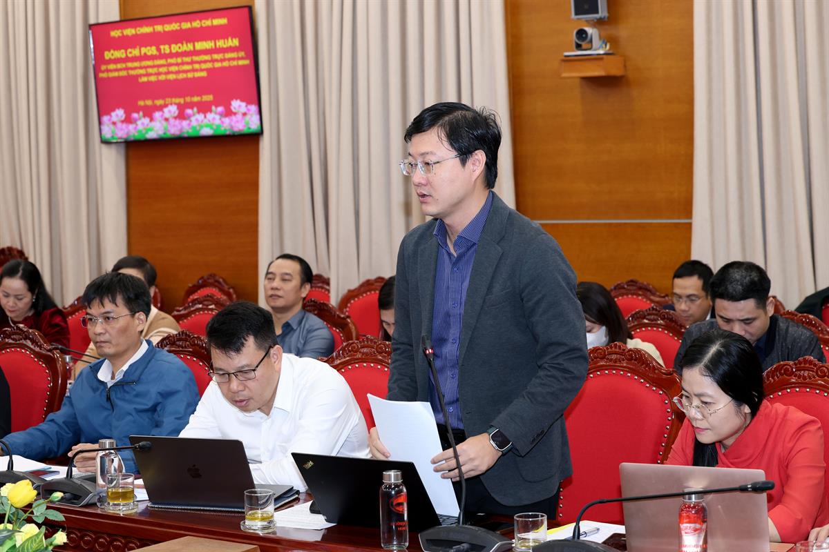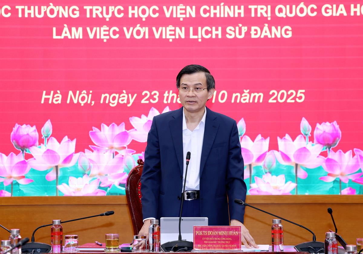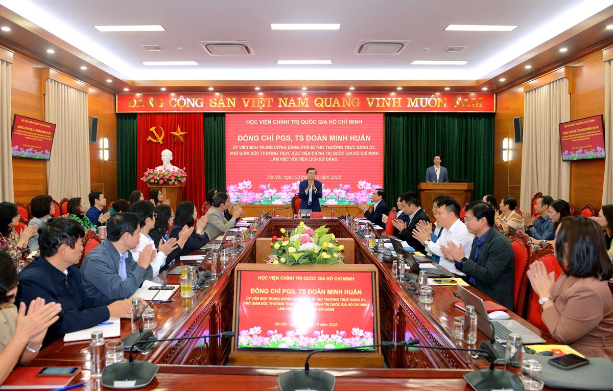 Phát biểu kết luận tại buổi làm việc, PGS,TS Đoàn Minh Huấn, Ủy viên Trung ương Đảng, Phó Giám đốc thường trực Học viện biểu dương, ghi nhận và đánh giá cao những kết quả mà Viện Lịch sử Đảng đã đạt được trong 5 năm qua. Viện đã khẳng định vị thế là đơn vị đầu ngành, trung tâm nghiên cứu, giảng dạy lịch sử Đảng uy tín hàng đầu trong hệ thống Học viện Chính trị quốc gia Hồ Chí Minh và trong cả nước. Viện đã xây dựng được đội ngũ cán bộ, giảng viên đoàn kết, ổn định, có bản lĩnh chính trị, trình độ chuyên môn cao, thể hiện tinh thần trách nhiệm và niềm đam mê khoa học. Công tác nghiên cứu khoa học và biên soạn lịch sử Đảng – từ lịch sử toàn Đảng đến lịch sử Đảng bộ các địa phương – đều có bước phát triển vượt bậc, góp phần quan trọng vào việc tổng kết thực tiễn, phát triển lý luận về Đảng Cộng sản Việt Nam, đặc biệt trong bối cảnh đổi mới và hội nhập quốc tế sâu rộng hiện nay.