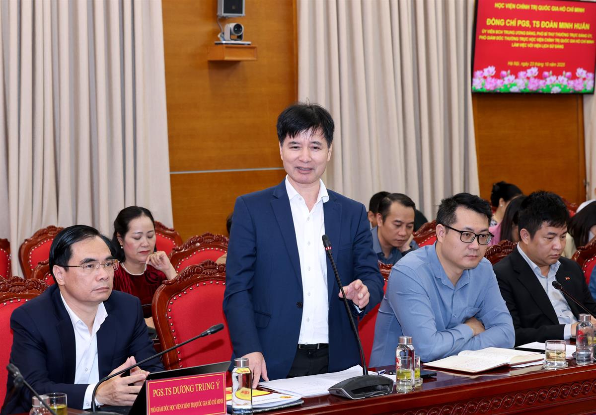 Phát biểu tại buổi làm việc, PGS,TS Dương Trung Ý, Phó Giám đốc Học viện bày tỏ vui mừng trước những kết quả toàn diện mà Viện Lịch sử Đảng đã đạt được trong giai đoạn 2020–2025. Đồng chí nhấn mạnh, Viện là đơn vị có truyền thống hơn 60 năm xây dựng và trưởng thành, luôn giữ vai trò nòng cốt trong nghiên cứu, giảng dạy và biên soạn lịch sử Đảng. Viện đã có nhiều đóng góp quan trọng trong việc nghiên cứu, biên soạn, tổng kết lịch sử Đảng; đặc biệt là trong công tác tham mưu triển khai, sơ kết, tổng kết Chỉ thị 20-CT/TW, hướng dẫn quy trình biên soạn lịch sử Đảng bộ các cấp, cũng như biên soạn và thẩm định nhiều công trình lịch sử có giá trị. Tạp chí Lịch sử Đảng tiếp tục khẳng định vị thế, uy tín của một tạp chí khoa học hàng đầu, đóng góp tích cực vào công tác tuyên truyền, giáo dục truyền thống cách mạng.