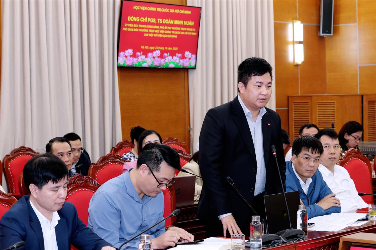 PGS,TS Đoàn Minh Huấn cũng nhấn mạnh yêu cầu ứng dụng công nghệ trong số hóa tư liệu lịch sử, xây dựng ngân hàng dữ liệu điện tử về lịch sử Đảng phục vụ nghiên cứu, giảng dạy và giáo dục truyền thống cách mạng. Việc phân loại, lưu trữ, bảo quản tư liệu số hóa và không số hóa cần được tổ chức khoa học, đồng bộ, bảo đảm khả năng truy cập, khai thác và bảo tồn lâu dài. Đồng chí lưu ý, lịch sử quan trọng nhất là giáo dục lịch sử, do đó, Viện Lịch sử Đảng cần tăng cường phối hợp với các cơ quan, đơn vị trong và ngoài Học viện để đưa tri thức lịch sử Đảng vào giáo dục chính trị, đạo đức, tư tưởng, nhất là trong trường học, bảo tàng, công viên lịch sử, tạo không gian trải nghiệm và lan tỏa sâu sắc giá trị của lịch sử cách mạng Việt Nam.