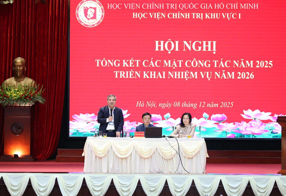 Qua các báo cáo tổng kết của đơn vị và các ý kiến phát biểu tại Hội nghị, PGS,TS Dương Trung Ý, Ủy viên Ban Thường vụ Đảng ủy, Phó Giám đốc Học viện ghi nhận và đánh giá cao công tác chuẩn bị nội dung hội nghị, cũng như những kết quả nổi bật mà Học viện I đã đạt được trong năm 2025. Nhấn mạnh ý nghĩa đặc biệt của năm 2025, PGS,TS Dương Trung Ý cho biết, năm 2025 là năm kỷ niệm 95 năm thành lập Đảng Cộng sản Việt Nam, 135 năm Ngày sinh Chủ tịch Hồ Chí Minh và 50 năm giải phóng miền Nam, thống nhất đất nước, 80 năm khai sinh ra nước Việt Nam Dân chủ cộng hòa - nay là Cộng hòa xã hội chủ nghĩa Việt Nam. Đồng thời, cũng là năm thực hiện những quyết sách quan trọng để đất nước chuyển mình. Trong bối cảnh đó, với sự cố gắng, nỗ lực và đoàn kết của toàn thể lãnh đạo, cán bộ, viên chức, Học viện chính trị khu vực I đã phát huy truyền thống vẻ vang, tăng cường khối đoàn kết, đạt được những kết quả nổi bật và những thành tích rất quan trọng trên các mặt công tác, PGS,TS Dương Trung Ý khẳng định.