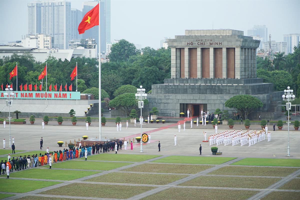 Trước phiên khai mạc Kỳ họp thứ 10, Quốc hội Khóa XV, lãnh đạo Đảng, Nhà nước và các đại biểu Quốc hội đến đặt vòng hoa và vào Lăng viếng Chủ tịch Hồ Chí Minh.