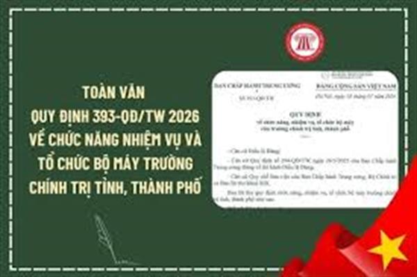 Thay mặt Ban Bí thư, đồng chí Trần Cẩm Tú, Ủy viên Bộ Chính trị, Thường trực Ban Bí thư đã ký ban hành Quy định số 393-QĐ/TW ngày 05/01/2026 về chức năng, nhiệm vụ, tổ chức bộ máy của trường chính trị tỉnh, thành phố (Quy định số 393-QĐ/TW).
