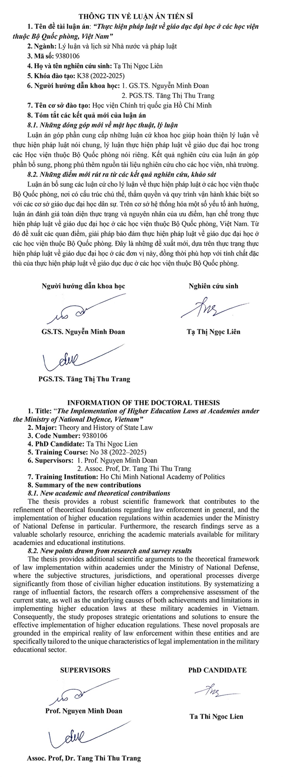 Luận án và tóm tắt luận án của Nghiên cứu sinh Dương Văn Chăm sau bảo vệ cấp Học viện