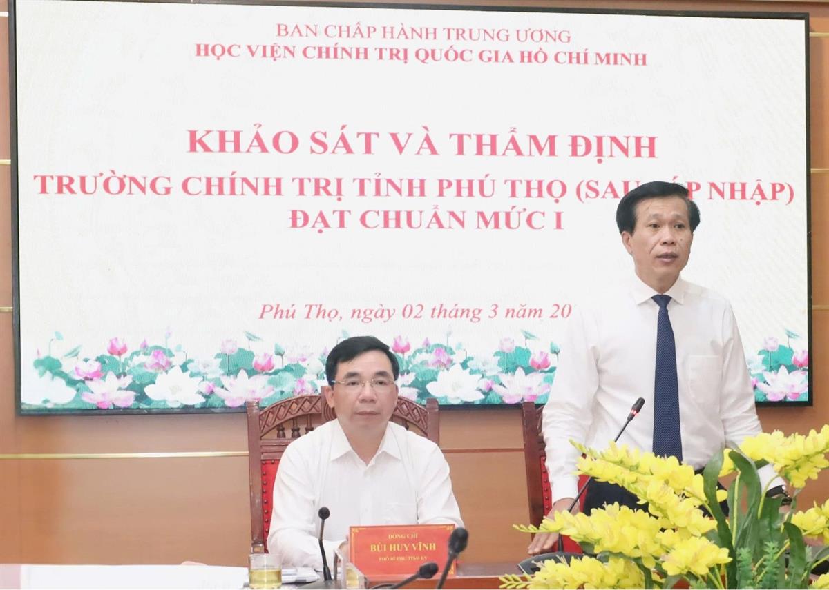 Chiều 02/3/2026, Đoàn công tác của Học viện Chính trị quốc gia Hồ Chí Minh do PGS,TS Hoàng Phúc Lâm - Phó Bí thư Đảng ủy, Phó Giám đốc Học viện làm Trưởng đoàn đã tiến hành khảo sát, thẩm định Trường Chính trị tỉnh Phú Thọ, đạt chuẩn mức 1 sau sáp nhập theo Quy định số 11-QĐ/TW của Ban Bí thư. Tham dự buổi làm việc có đồng chí Bùi Huy Vĩnh - Phó Bí thư Tỉnh ủy, cùng lãnh đạo các sở, ban, ngành của tỉnh và Ban Giám hiệu, trưởng các khoa, phòng của Nhà trường.