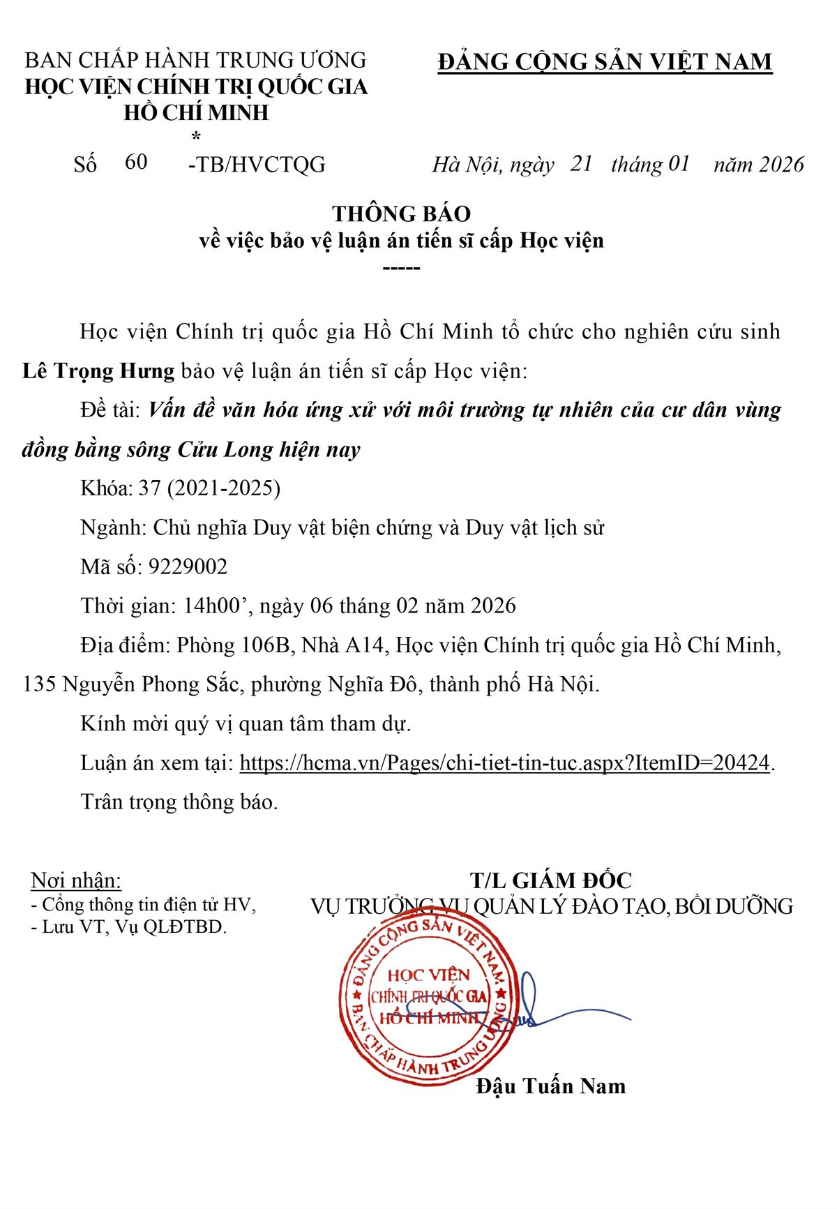 Thông báo bảo vệ luận án tiến sĩ cho Nghiên cứu sinh Lê Trọng Hưng
