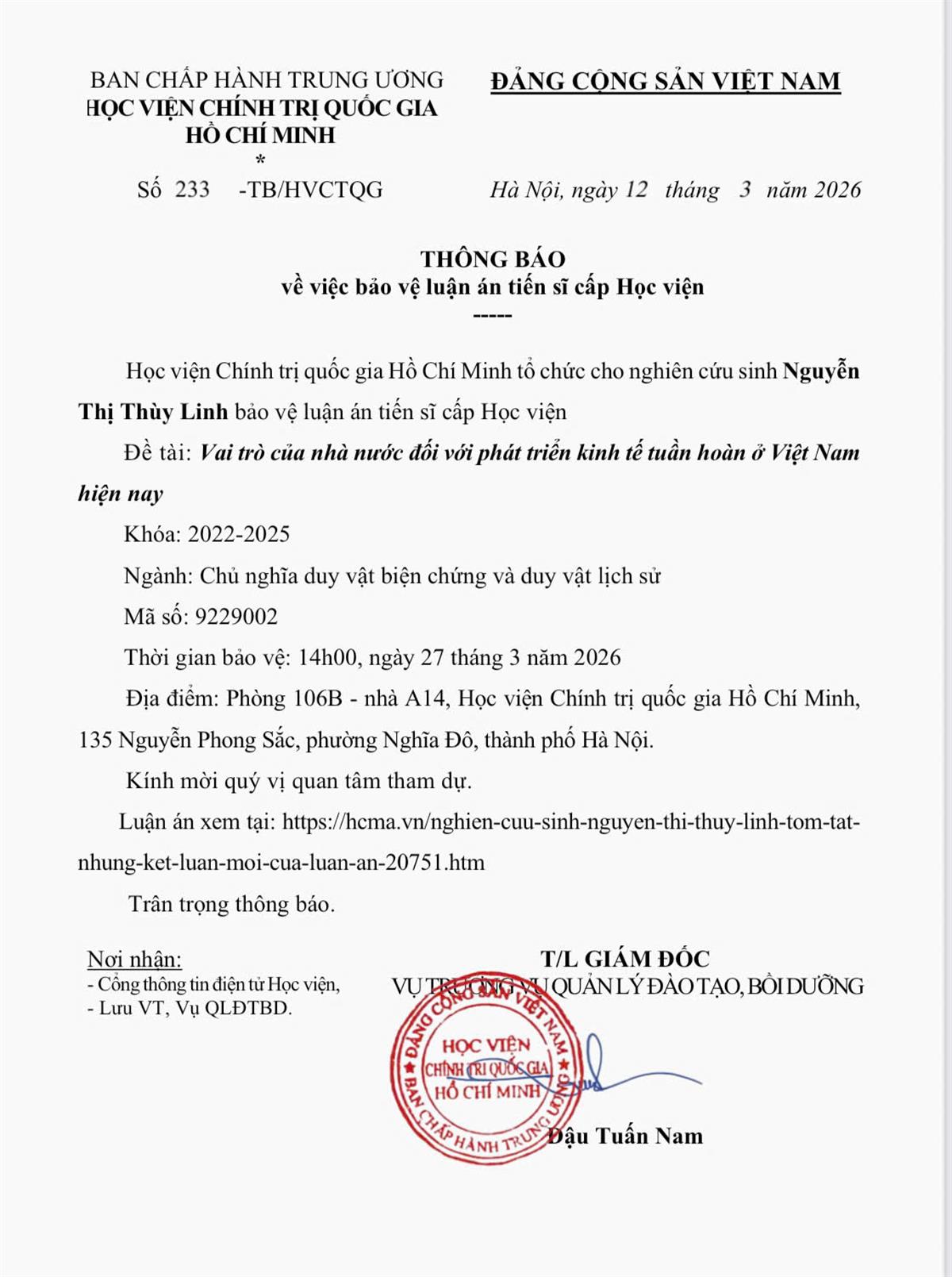Thông báo tổ chức bảo vệ luận án tiến sĩ cho Nghiên cứu sinh Lê Thị Thu Hường