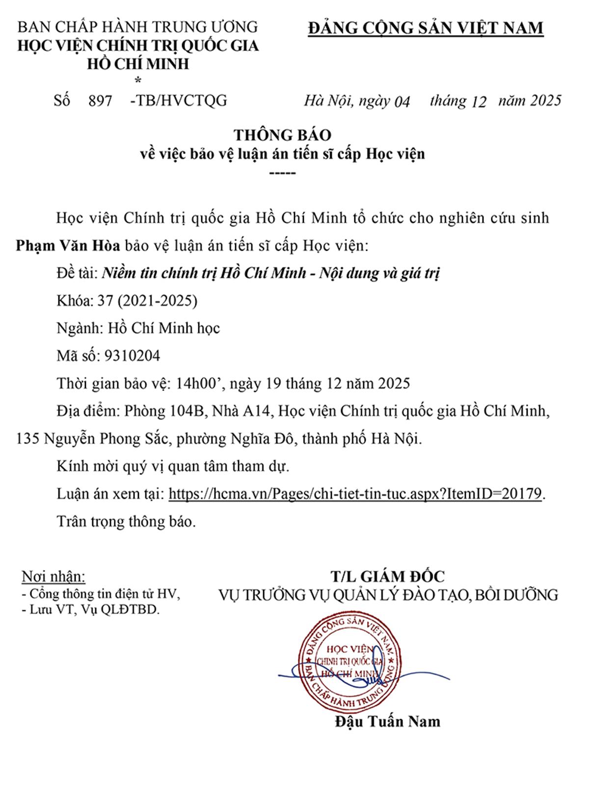 Thông báo tổ chức bảo vệ luận án tiến sĩ cho Nghiên cứu sinh Phạm Văn Hòa