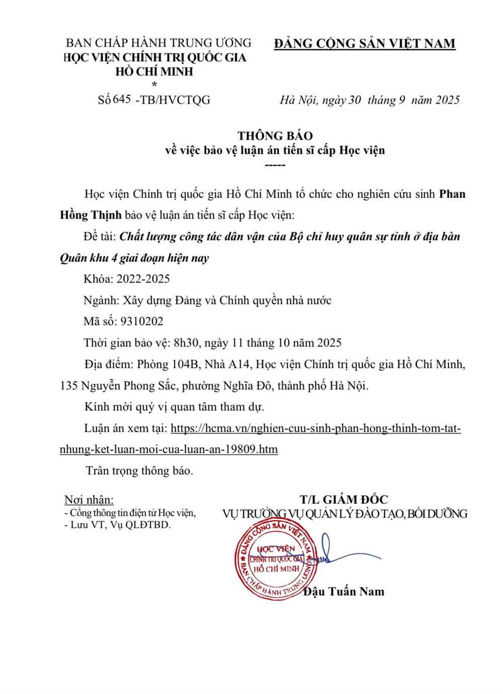 Thông báo tổ chức bảo vệ luận án tiến sĩ cho Nghiên cứu sinh Phan Hồng Thịnh