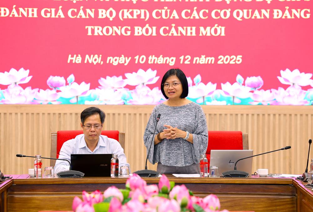 Trong các cơ quan Đảng, trách nhiệm tham mưu, tổ chức thực hiện nghị quyết, giám sát và phản biện là nhiệm vụ có tính đặc thù. Do đó, KPI phải phản ánh được năng lực, trách nhiệm và hiệu quả thực thi nhiệm vụ của từng cán bộ, công chức. Việc phân định rõ nhóm công chức và nhóm viên chức để xây dựng các hệ chỉ số phù hợp cũng được nhấn mạnh nhằm bảo đảm tính công bằng và khả thi trong áp dụng. ThS Đỗ Thanh Huyền cho biết UNDP mong muốn tổng hợp kinh nghiệm, xây dựng các khuyến nghị chính sách và hình thành hệ thống chỉ số phù hợp để hỗ trợ hiệu quả công tác đánh giá trong tương lai.