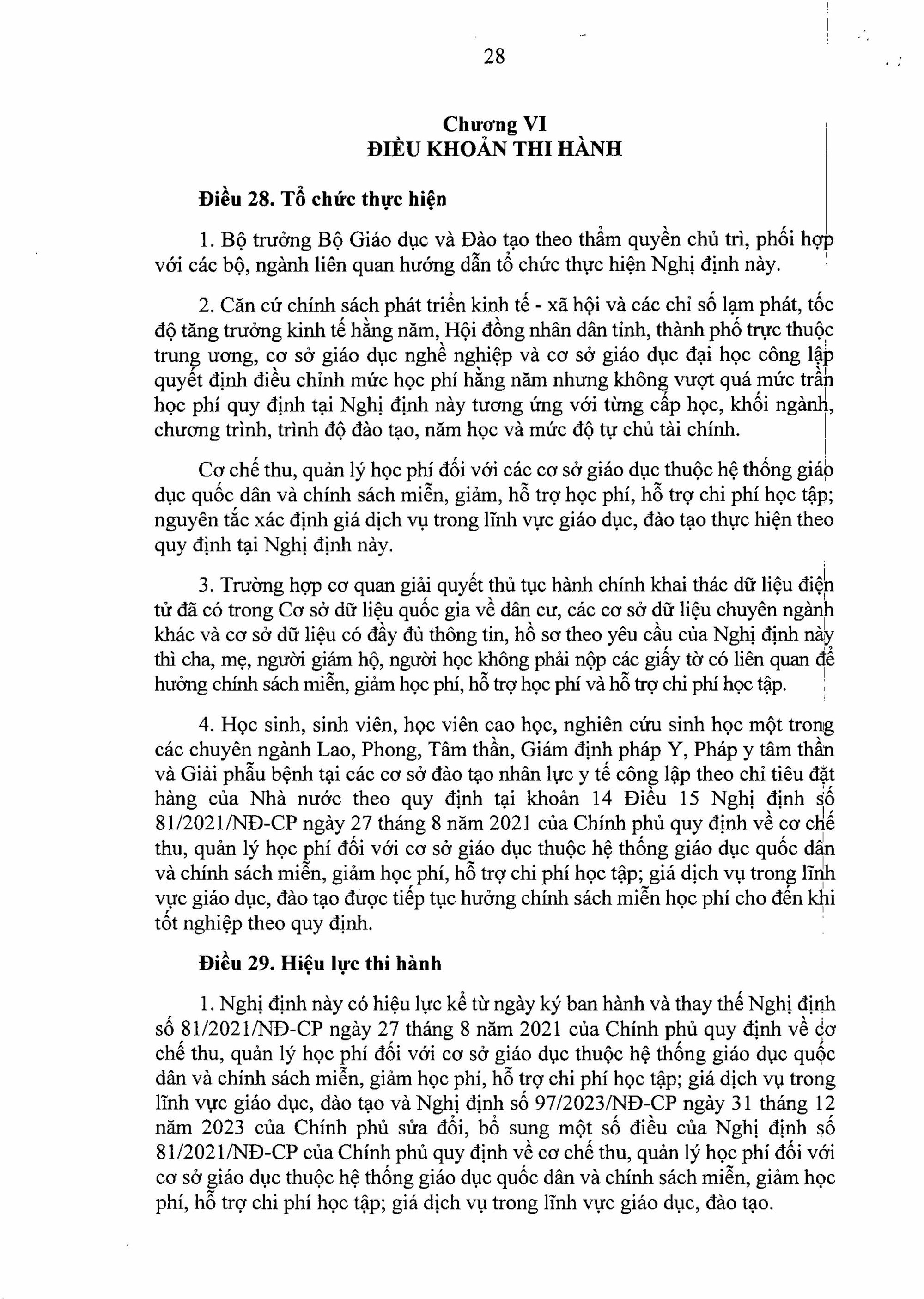 Nghị định này có hiệu lực kể từ ngày ký ban hành và thay thế Nghị định số 81/2021/NĐ-CP ngày 27/8/2021 của Chính phủ quy định về cơ chế thu, quản lý học phí đối với cơ sở giáo dục thuộc hệ thống giáo dục quốc dân và chính sách miễn, giảm học phí, hỗ trợ chi phí học tập; giá dịch vụ trong lĩnh vực giáo dục và đào tạo và Nghị định số 97/2023/NĐ-CP ngày 31/12/2023 của Chính phủ sửa đổi, bổ sung một số điều của Nghị định số 81/2021/NĐ-CP của Chính phủ quy định về cơ chế thu, quản lý học phí đối với cơ sở giáo dục thuộc hệ thống giáo dục quốc dân và chính sách miễn, giảm học phí, hỗ trợ chi phí học tập; giá dịch vụ trong lĩnh vực giáo dục, đào tạo.